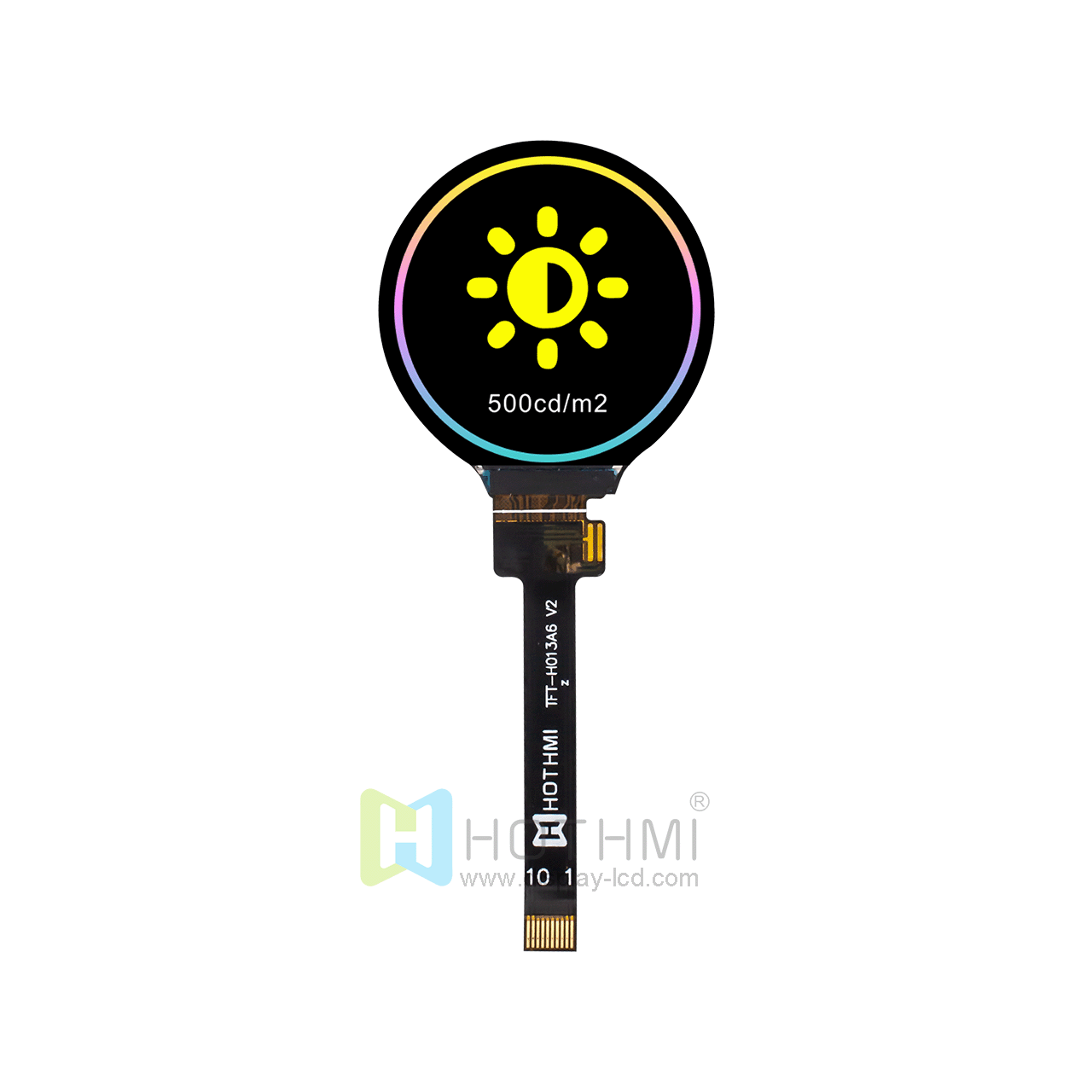 This 1.3-inch round TFT LCD display features a unique 47.5mm long cable, making it easy for users to assemble it onto a driver board. Different cable lengths and brightness models are also available: TFT-H013A6QQIGC7N10 and TFT-H013A6QQIGC7N10-V1. We also offer a module including a driver board: HTM-H013A6-UART-A02. In addition, we also offer a circular display of the same size, the TFT-H013A1HQIST3N16 circular display with a 16-pin MIPI interface, providing you with more options.