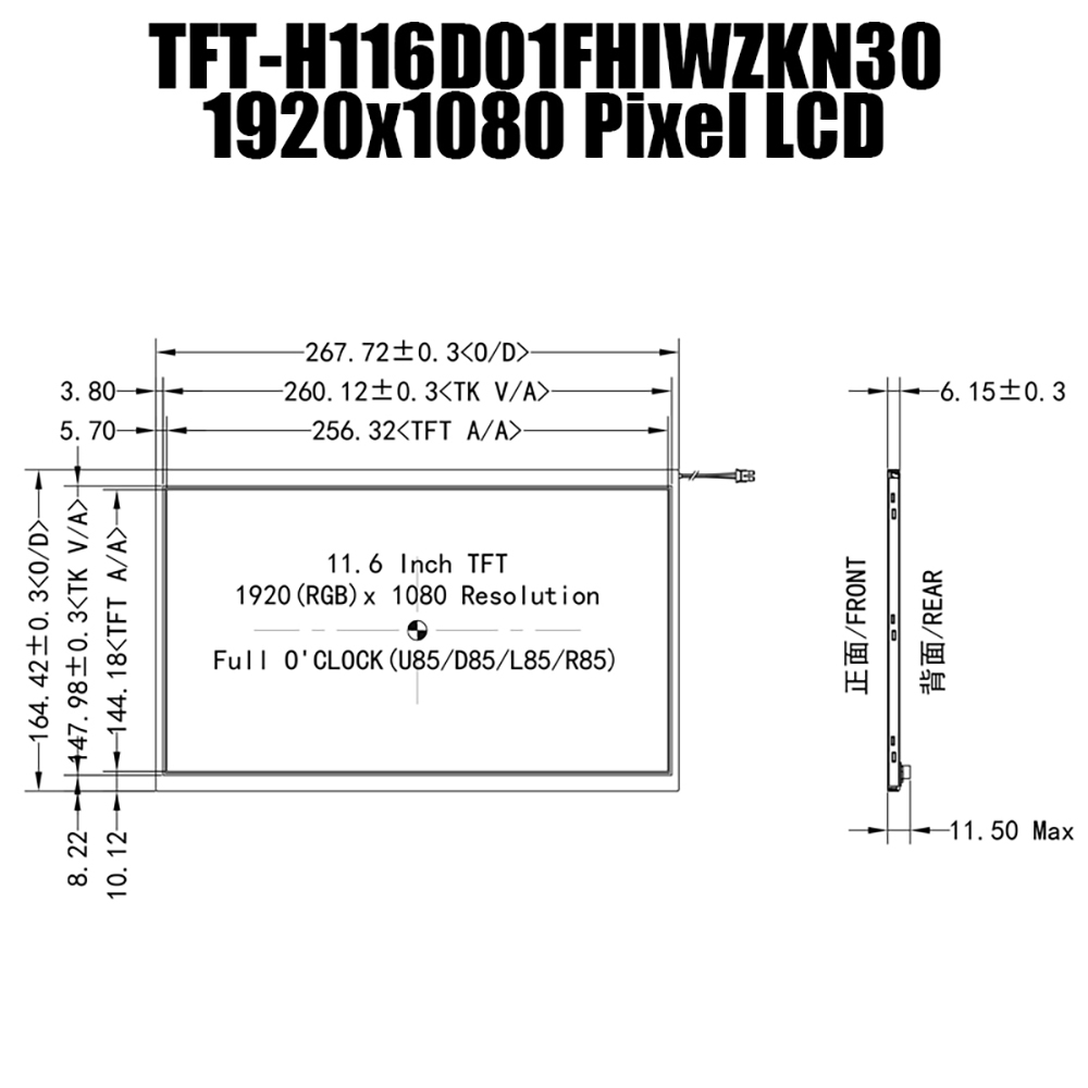 TFT-H116D01FHIWZKN30 | 11.6-inch TFT High-Definition LCD Screen | eDP Interface | 1920×1080 Pixel Resolution LCD Screen | Selectable Capacitive Touch/Resistive Touch | Clearly Visible in Sunlight