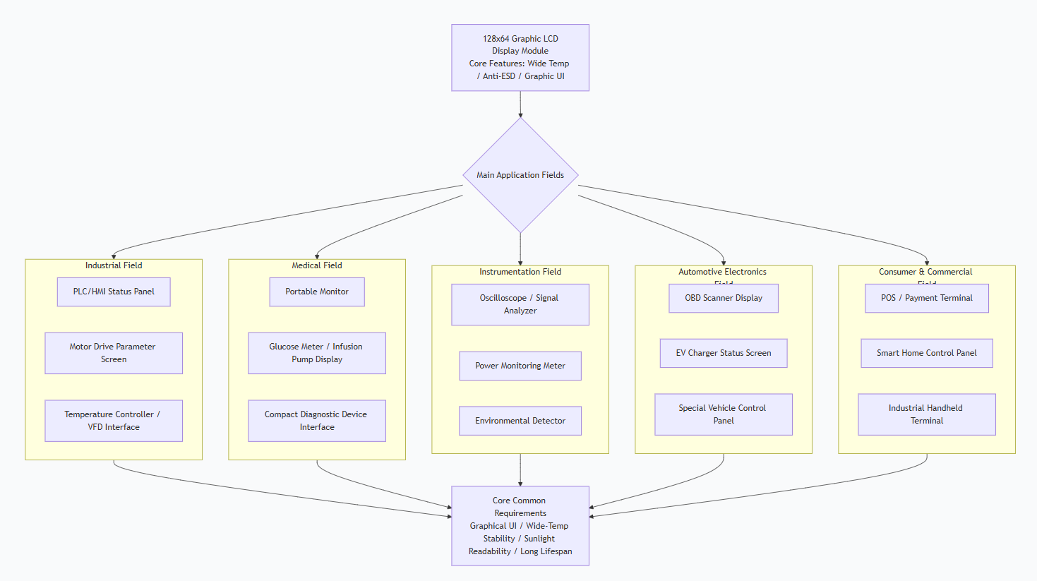 This chart illustrates how the 128×64 Graphic LCD Display Module meets the core needs of multiple demanding fields—graphical UI capability, wide-temperature stability, sunlight readability, and industrial-grade reliability. From complex industrial status displays to clear medical data presentation and stable readability in outdoor environments, this module provides a clear, reliable, and cost-effective display solution for equipment across various industries.