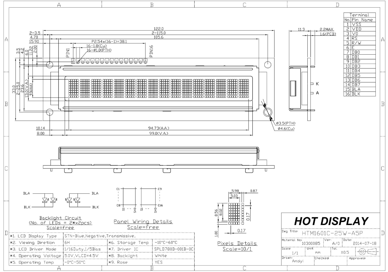Specifications of the 16×1 Character LCD Module
