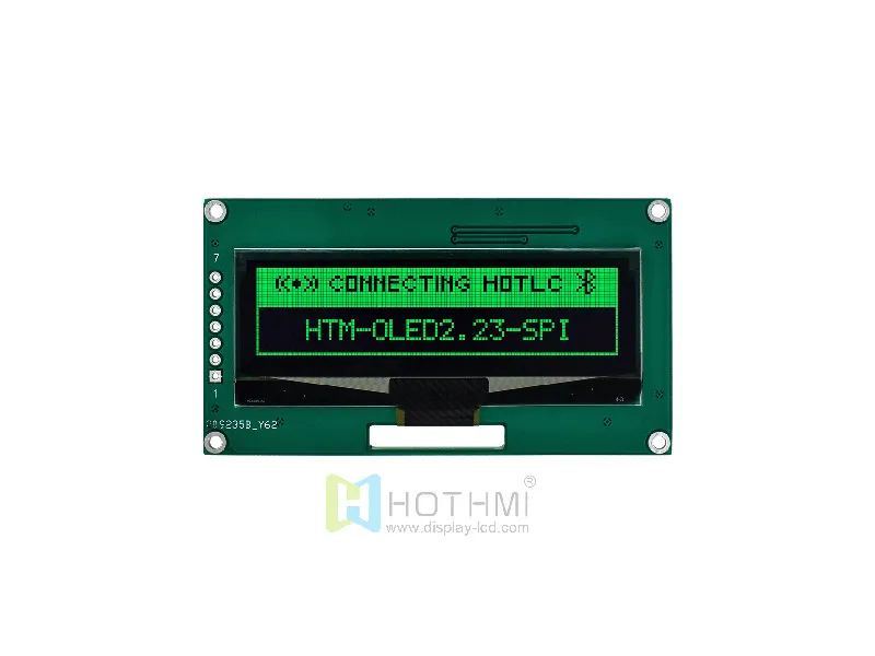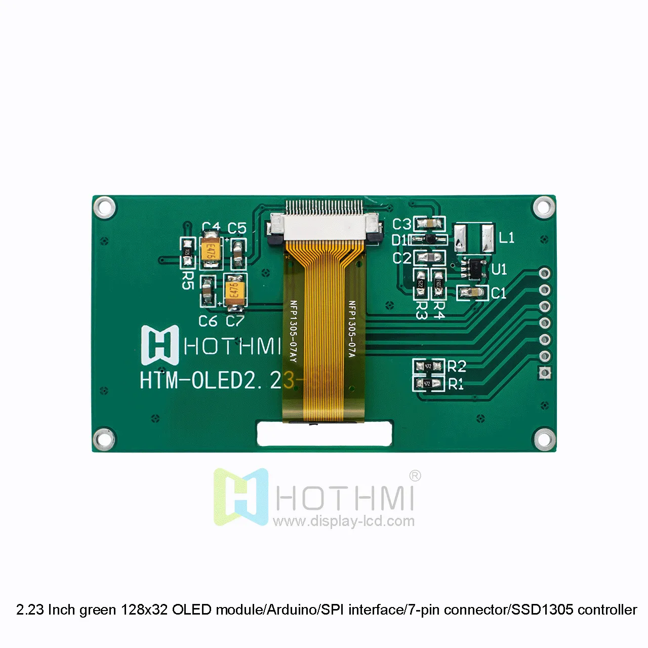 This product 2.23 Inch OLED module and OLED display technology is self-luminous, designed to provide high visibility and ensure easy reading from any angle in different environments. This model has a resolution of 128×32 and belongs to a graphical OLED display with high viewing contrast and bright green graphics on a dark black background. With this OLED, you can expect the fastest response time. It is a passive matrix display with built-in SPI interface options, is fully compatible with Arduino, integrates seamlessly with many different electronic systems, and is suitable for a variety of applications. The display also comes with a 7-pin connector and a built-in SSD1305 controller. The HTM-OLED2.23-SPI-G model is designed to withstand extreme operating conditions and performs well when used in the temperature range of-40 to 85 degrees Celsius. It requires a 3.3V power supply to operate and is RoHS compliant.