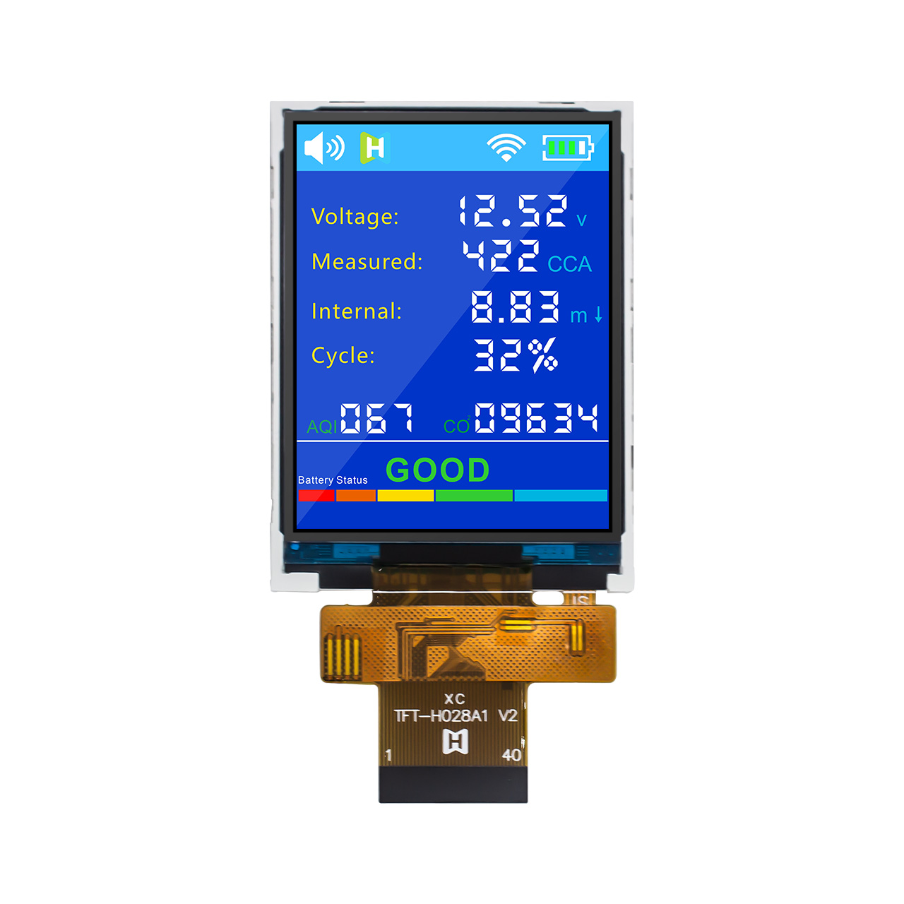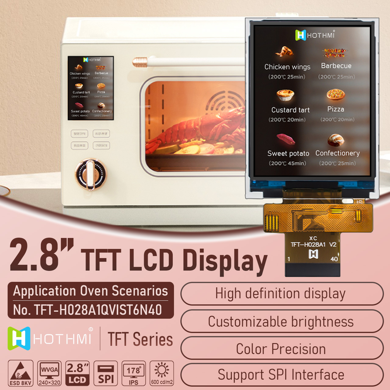 The TFT-H028A1QVIST6N40 is a 2.8-inch TFT LCD with a 240×320 resolution and IPS full-viewing angle, delivering high-definition image quality from any viewing angle. Its brightness is approximately 600 cd/m², and the backlight brightness can be adjusted to suit customer needs. It features a built-in ST7789V controller and is a non-touchscreen model.
